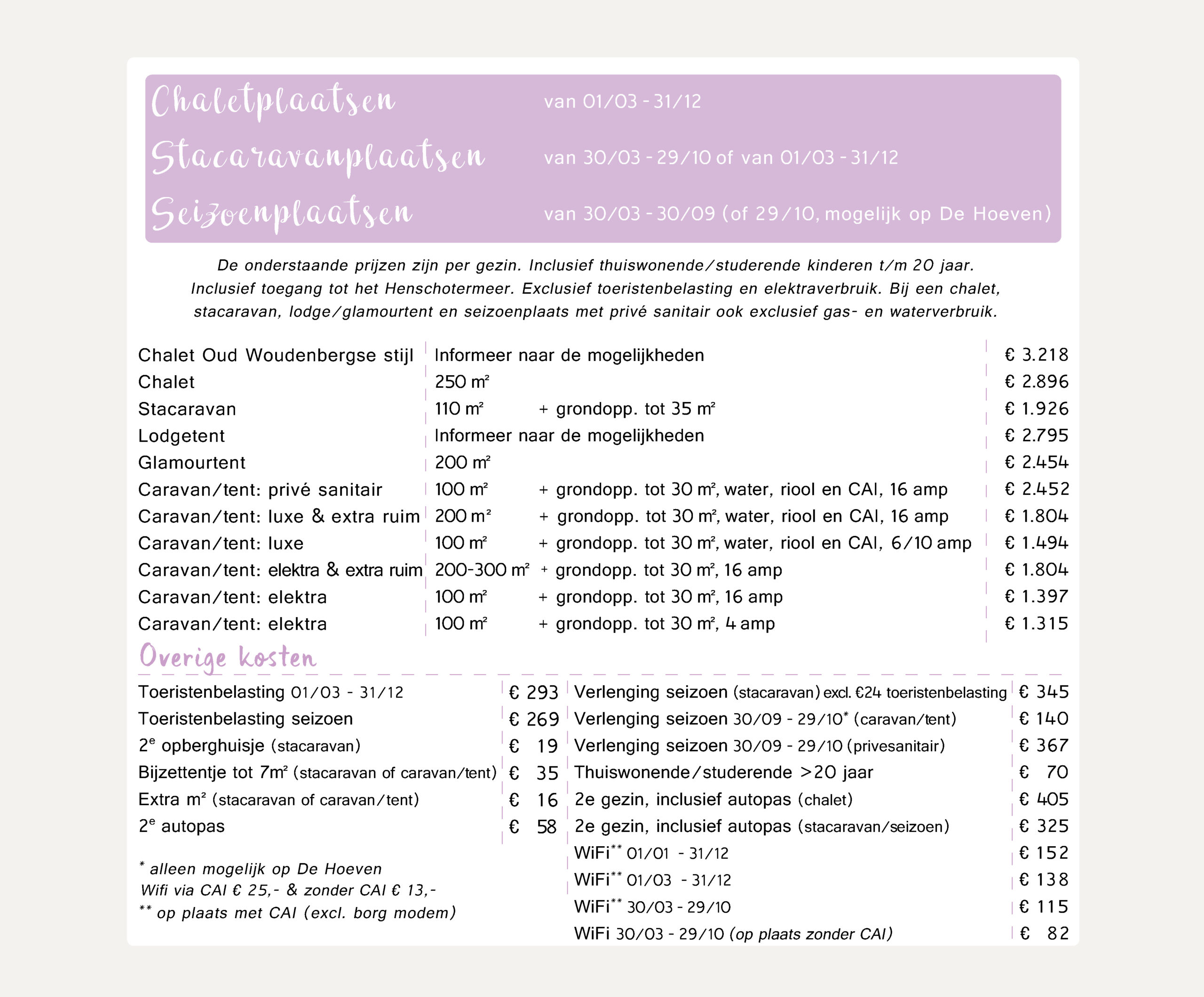 Bekijk hier alle prijzen voor seizoensplaatsen.