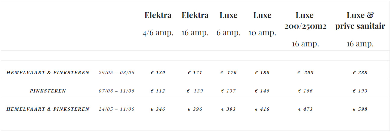 De onderstaande arrangementen zijn inclusief 4 personen, caravan/tent & auto of camper, elektra en toeristenbelasting. De douches werken op 0,50 euro munten.